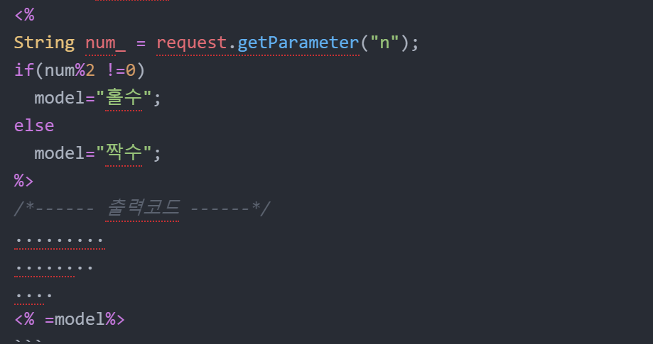 /*----- 입력코드 ------*/ <% String num_ = request.getParameter("n"); if(num%2 !=0) model="홀수"; else model="짝수"; %> /*------ 출력코드 ------*/ ......... ........ .... <% =model%> - 이전 코드에서는 출력부분에서 코드를 직접 통제하기 때문에 입출력코드간의 연관성이 눈에 확 띄기 힘들다. 이는 코드가 길어질 수록 읽기조차 힘들어지게하는 요인이 될 수 있다.