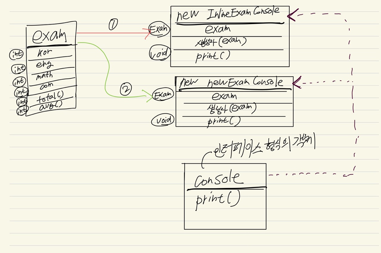 이때 만약 기존에 사용하던 InlineExamConsole이라는 부품을 newExamConsole이라는 부품으로 변경하고자 하고자 한다면 newExamConsole 객체의 생성자의 매개변수로 exam을 넣어 새로운 의존성을 주입할 수 있다.